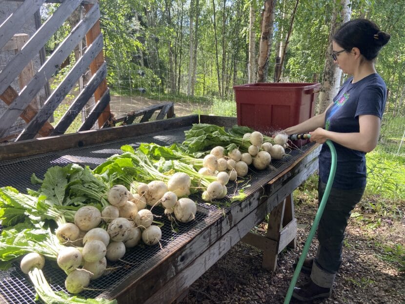 Farmhand Jeanetta Carroll washes turnips at Calypso Farm in Fairbanks, Alaska in summer 2023 (Photo Courtesy of Susan Willsrud/Calypso Farm)