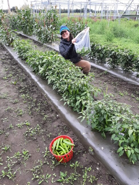Glenna Gannon harvesting peppers at the University of Alaska Fairbanks experiment farm in summer 2023 (Photo courtesy of Glenna Gannon)