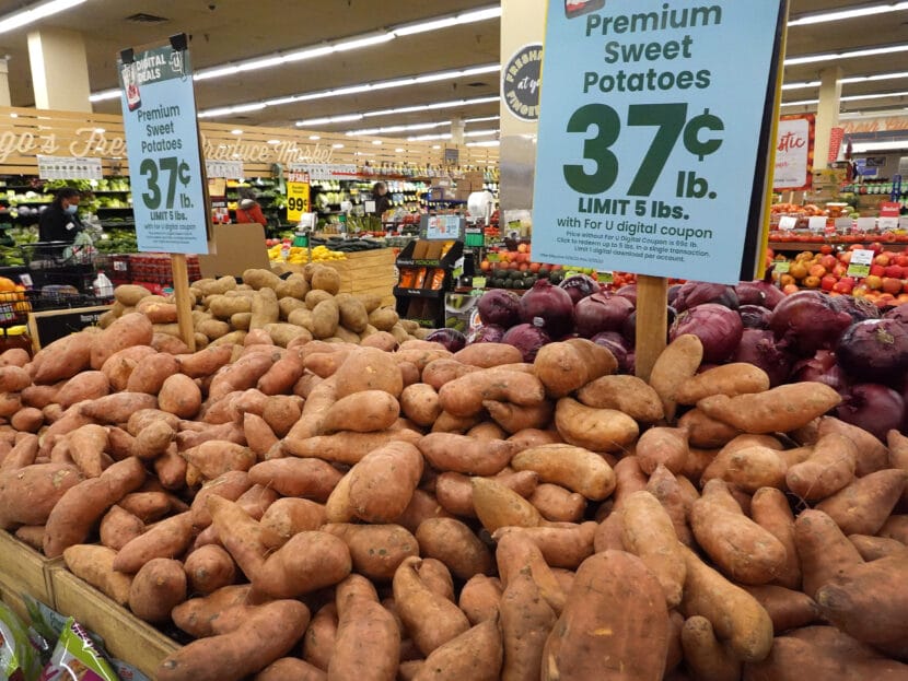Grocery prices overall are still higher than last year, including for sweet potatoes and pumpkin pie filling. (Scott Olson/Getty Images)