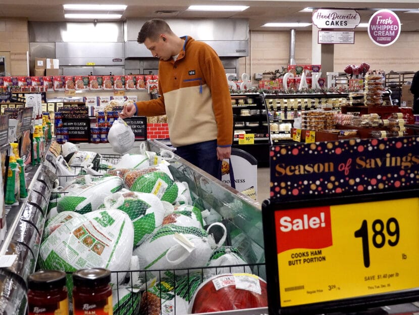 A customer in Chicago looks for turkeys offered for sale on Nov. 20, 2023, ahead of the Thanksgiving holiday. Turkey prices have fallen — but the cost of many groceries are still higher. (Scott Olson/Getty Images)