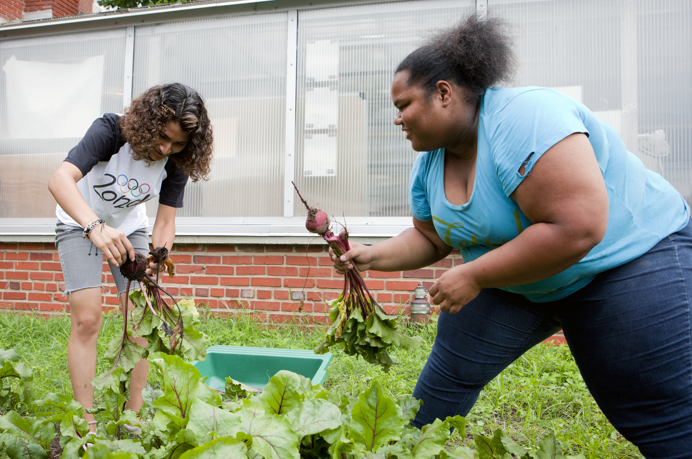 Yanci Flores (left) and Roshawn Little harvest beets from the garden at Eastern Senior High School on July 17. Lydia Thompson/NPR