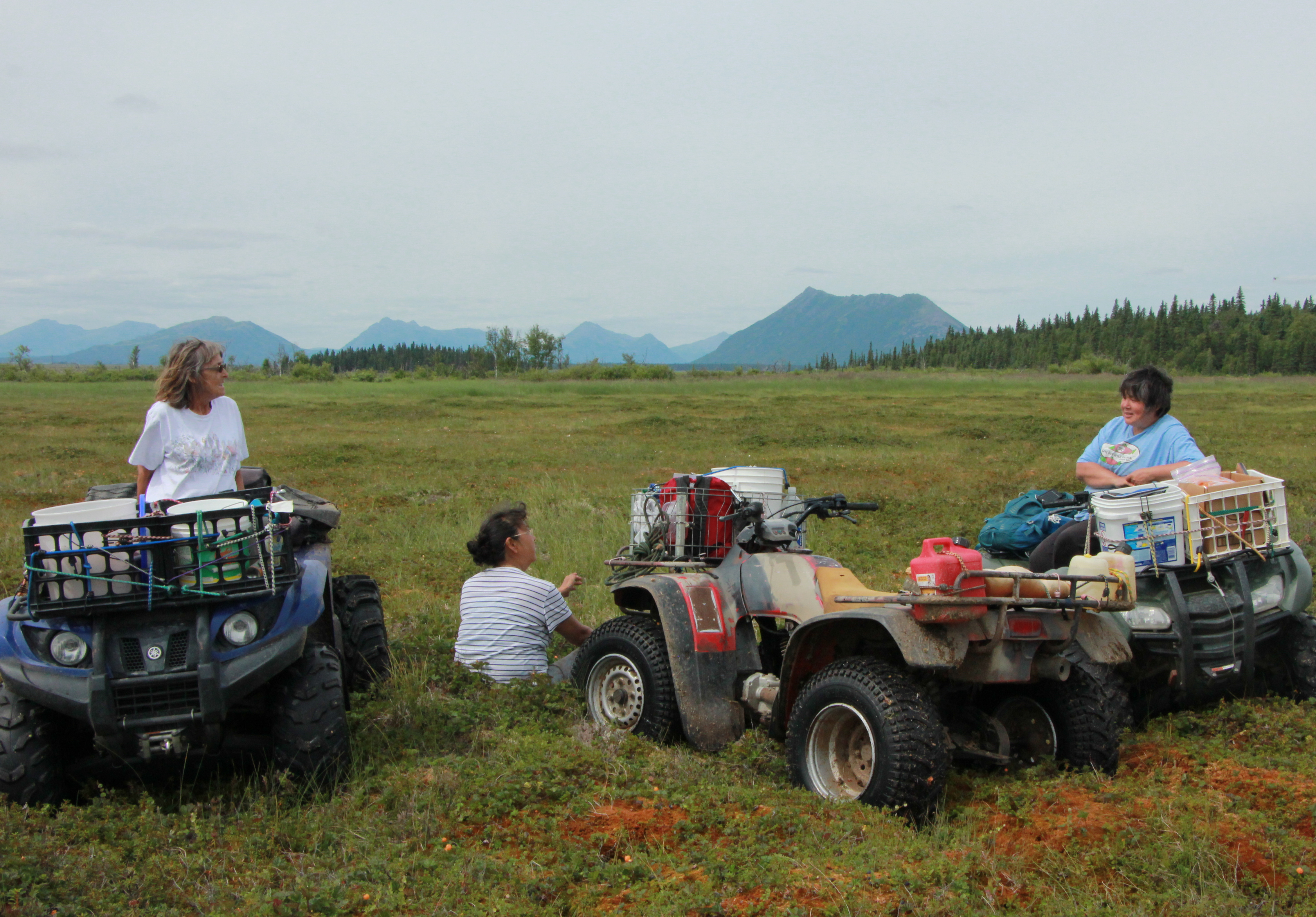 They load plastic buckets and quart-sized Ziploc bags onto their four-wheelers. Williams leads the group onto the tundra, picking her way between swampy patches. She’s heading toward one of their closely guarded berry spots.