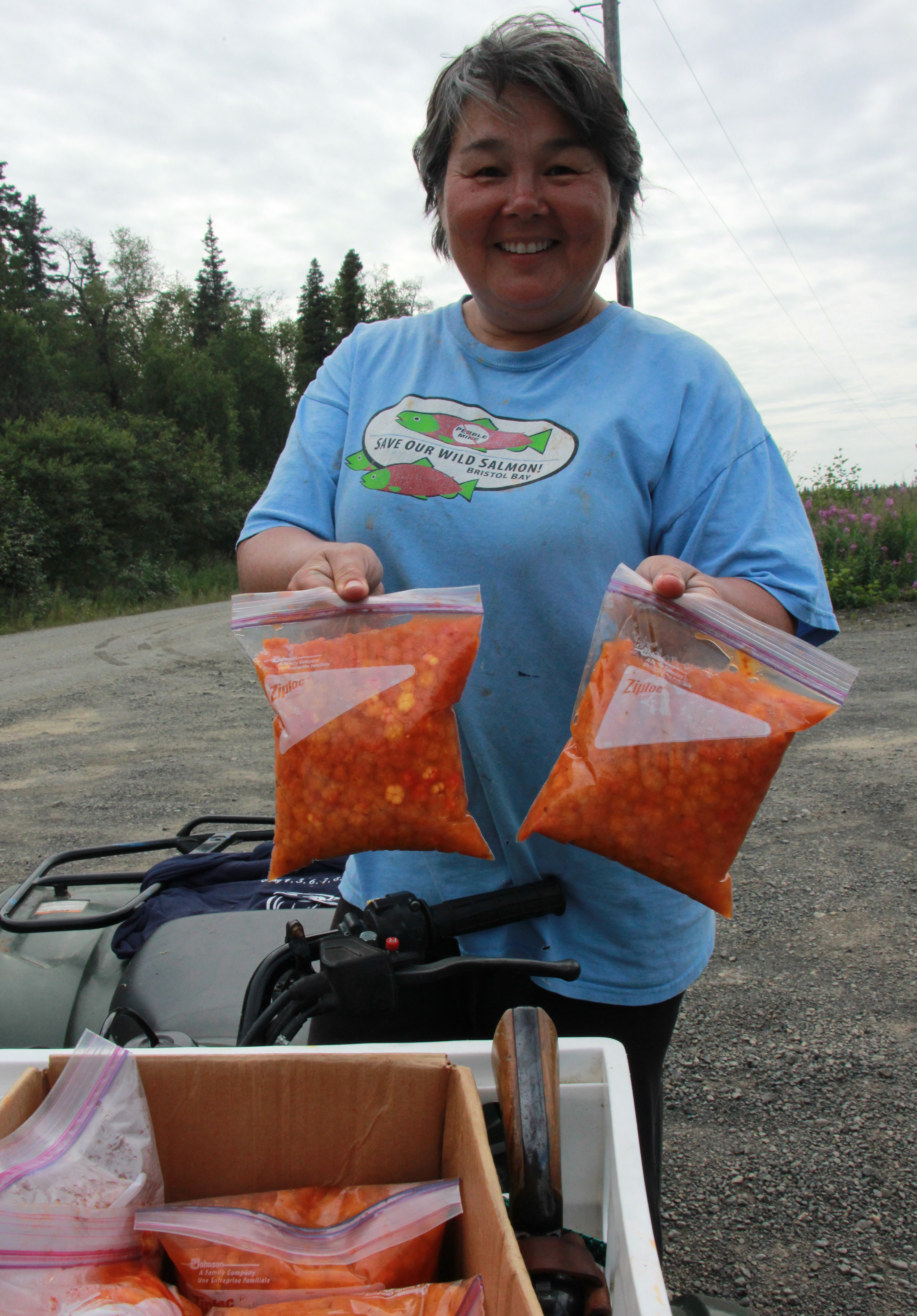 “Usually for my family we take out two bags when we’re going to have a meal of salmonberry akutaq, and I take blackberries or blueberries and I add it and it stretches it,” she says. “Now auntie Judy, she likes just strictly salmonberry akutaq. But she’s a picking fiend!”