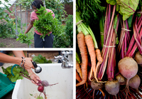 Top Left: Nychele Williams, 15, gathers basil in the garden at Eastern Senior High School. Bottom left: Yanci Flores rinses recently harvested beets. Right: Carrots and beets are displayed at the Aya farmers market, where students sell their produce on Saturdays. Lydia Thompson/NPR