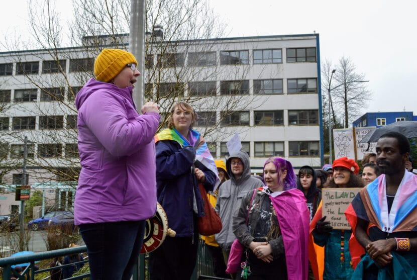 Daaljíni Mary Cruise, who helped organize the Unity for the Queer Community event, addresses those gathered on March 9, 2025. (Photo by Yvonne Krumrey/KTOO).