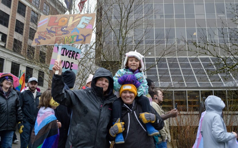 Wendi Siebold, her partner Ray Romberg, and their child marching at a demonstration to support Juneau’s queer and trans community on March 9, 2025. (Photo by Yvonne Krumrey/KTOO)