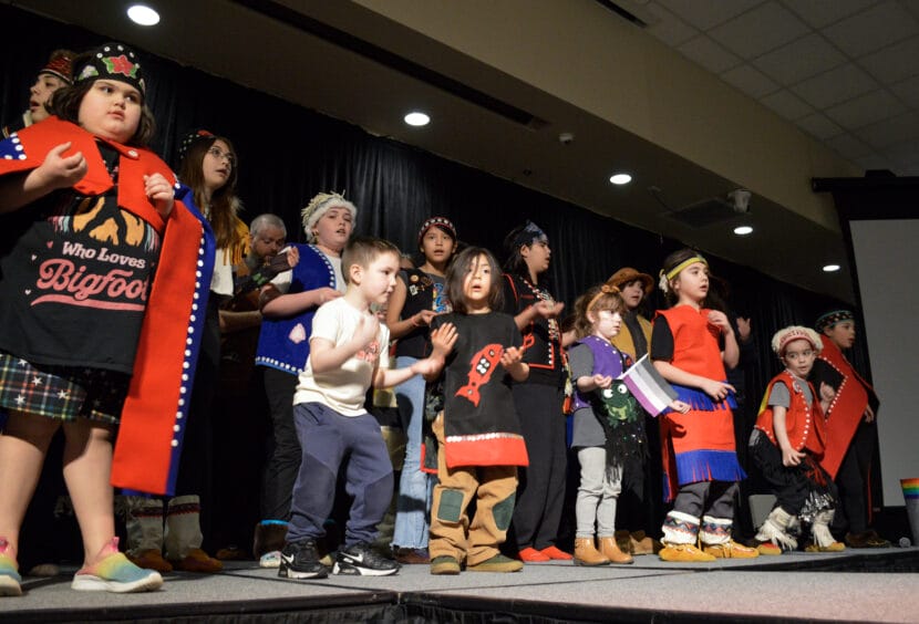 The Has Du Eetíx’ X’aakeidíx̱ Haa Sitee dance group performs for the Unity for the Queer Community event at Elizabeth Peratovich Hall in Juneau on March 9, 2025. (Photo by Yvonne Krumrey/KTOO).