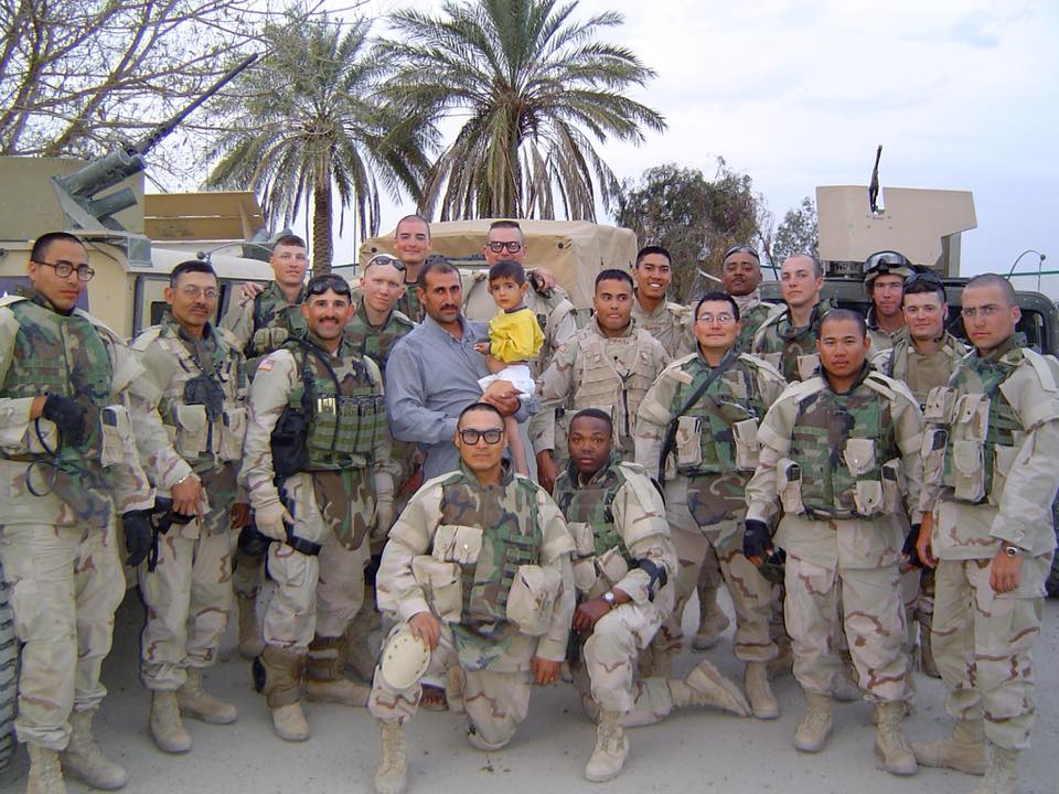 Joseph Murphy (from left, first man kneeling) served in the Iraq War. The squad was led by Ed Irizarry (standing to the left above Murphy). Mike Mercer (far right) was a gunner with Murphy. (Photo courtesy Ed Irizarry)