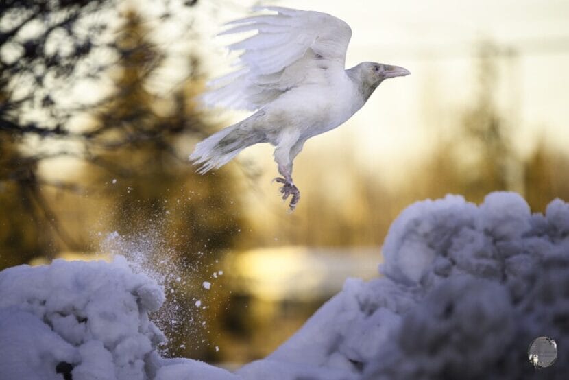 Almost every day you can find new photos of the raven on Facebook on a page called Anchorage White Raven Spottings. There, you can see the bird aloft with its feathers, translucent through the light, or at play with another raven in the snow. Someone recently snapped a shot of the raven, as it strutted with a slice of pizza in its beak.