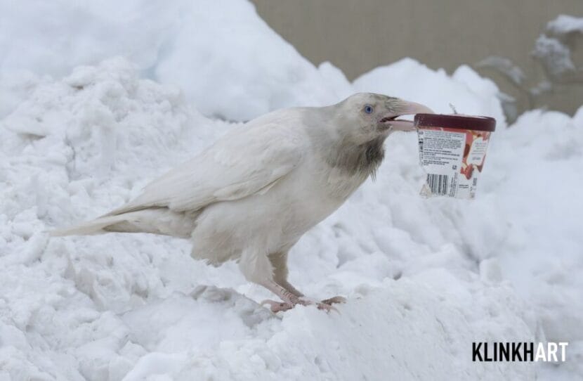 In fact, the white raven behaves more like an “alpha” bird. In a recent post, Klinkhart shared pictures of the raven in a spat with four black ravens over a discarded Häagen-Dazs carton of White Raspberry Chocolate Truffle ice cream. In the last photo in the series, the raven shows off its prize.