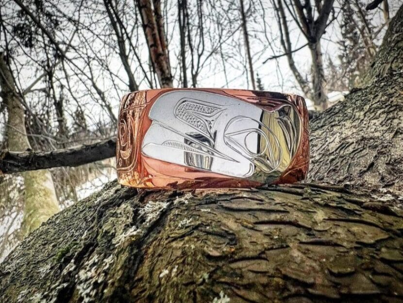 After seeing the photos, Jerrod Galanin felt the urge to fashion a Lingít-style, copper armband with the white raven in silver. Not long afterwards, it was as if the bird sought him out.