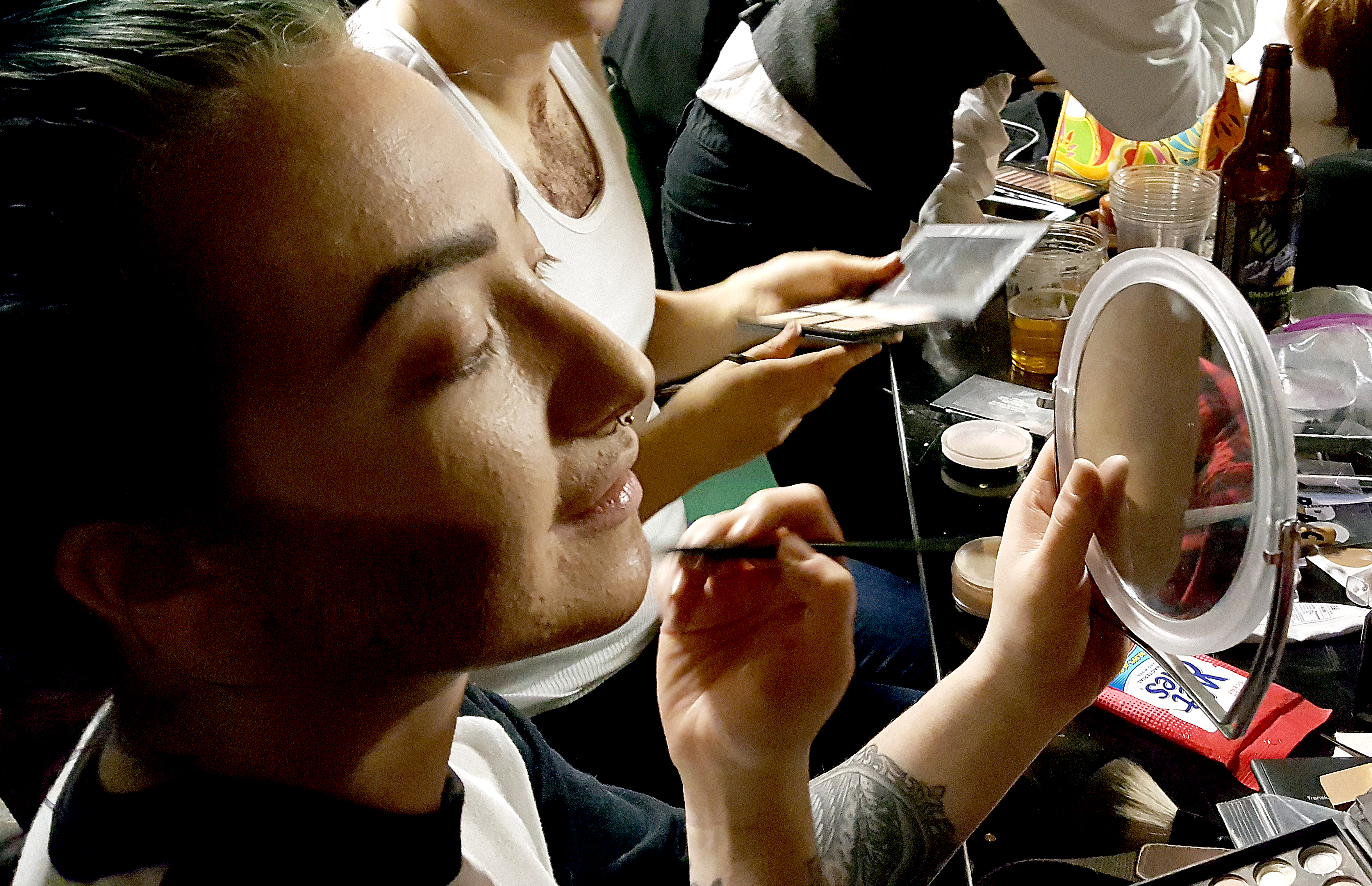 At a crowded makeup table, Ross, Davis and another king take turns applying highlights and lowlights, using a technique called contouring.