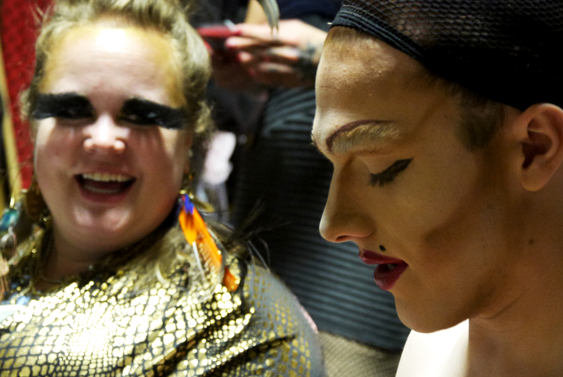 Ryan Hicks helps a fellow drag queen participant with makeup. Hicks portrayed drag queen Aquarius Valentine in the Friday amateur drag show at Rendezvous. (Photo by Tripp J Crouse/KTOO)