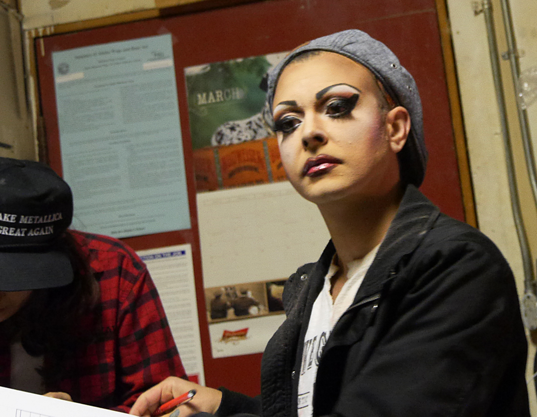 Cate Ross applies makeup to her face to transform into Ryder Strong backstage during Friday's Femme Fatale amateur drag show at the Rendezvous. (Photo by Tripp J Crouse/KTOO)