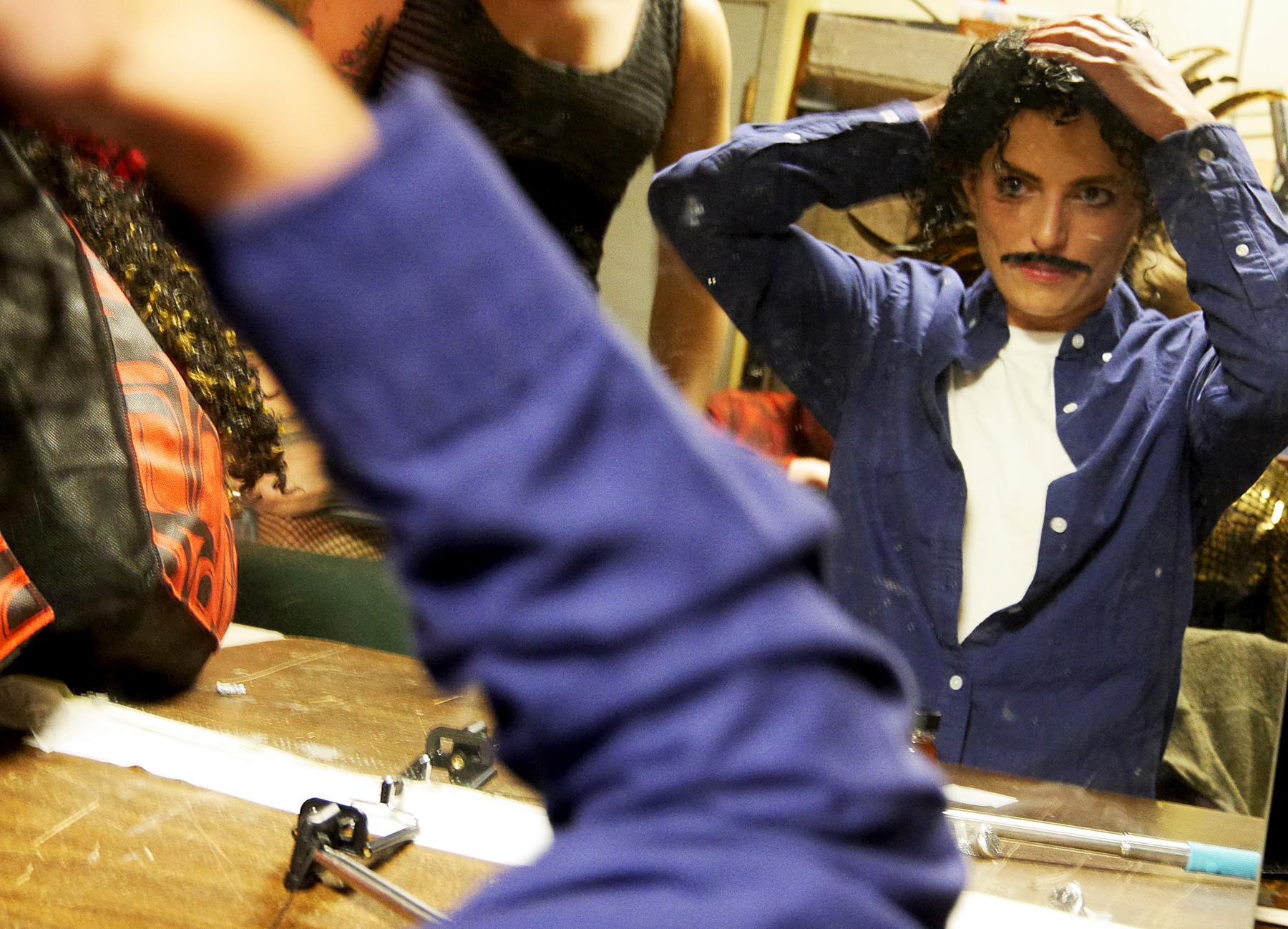 James Hoagland, who portrays drag queen GiGi Monroe, helps prep Friday night's lineup backstage at Rendezvous. (Photo by Tripp J Crouse/KTOO)
