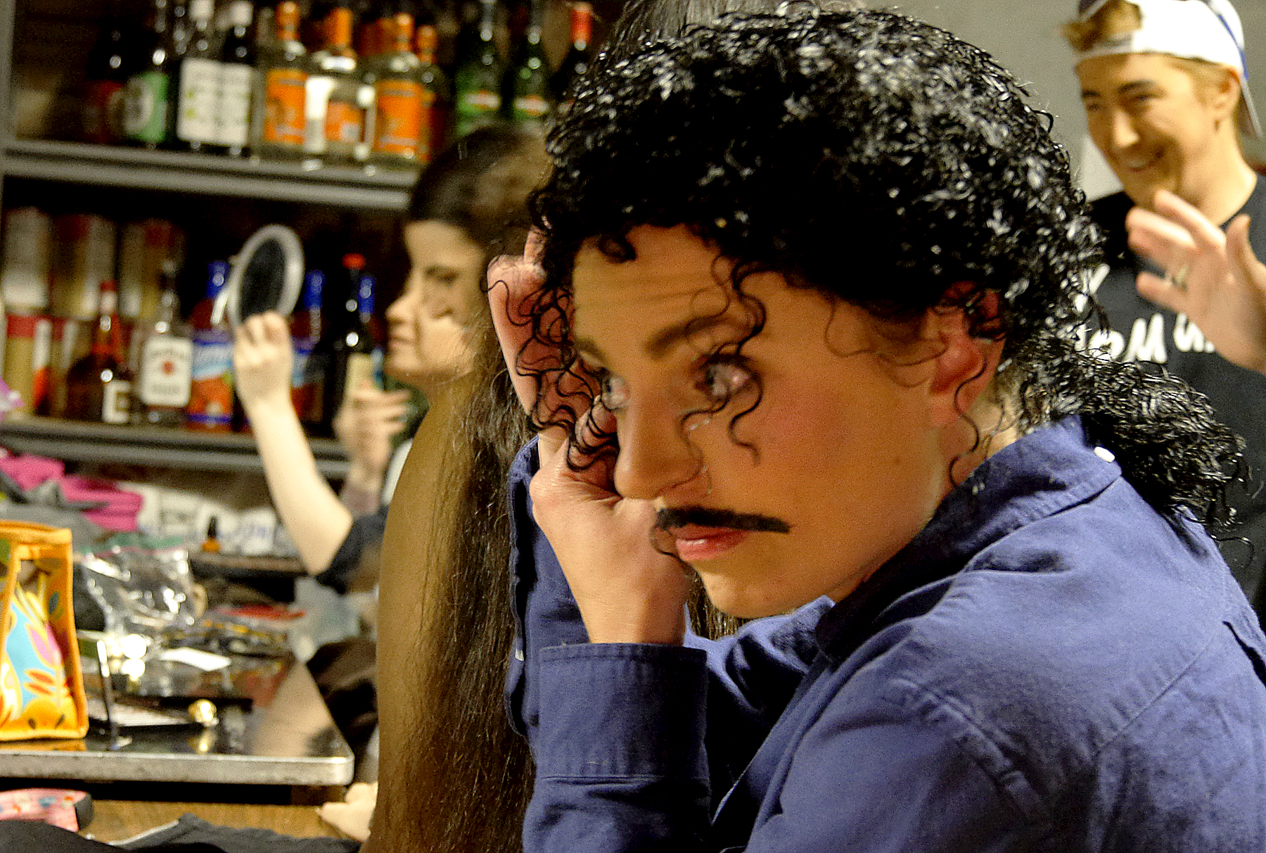Denise Wiltse applies bobby pins to attach her black wig to her hair. Wiltse performed to Michael Jackson's song "The Way You Make Me Feel" on Friday at Rendezvous. (Photo by Tripp J Crouse/KTOO)
