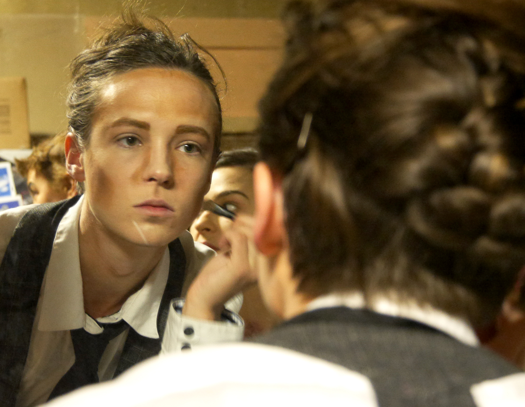 Stephanie Davis works on her contouring, a makeup process that creates highlights and lowlights, turning Davis' feminine features into a more masculine look. (Photo by Tripp J Crouse/KTOO)