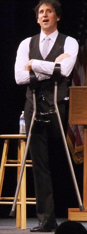 Sundquist uses forearm crutches to get around, but most of the time during his talk they hung from his arms as he stood perfectly balanced on his right leg. Some of his speech sounded like a comedy routine as he regaled the audience with stories about living with his disability.