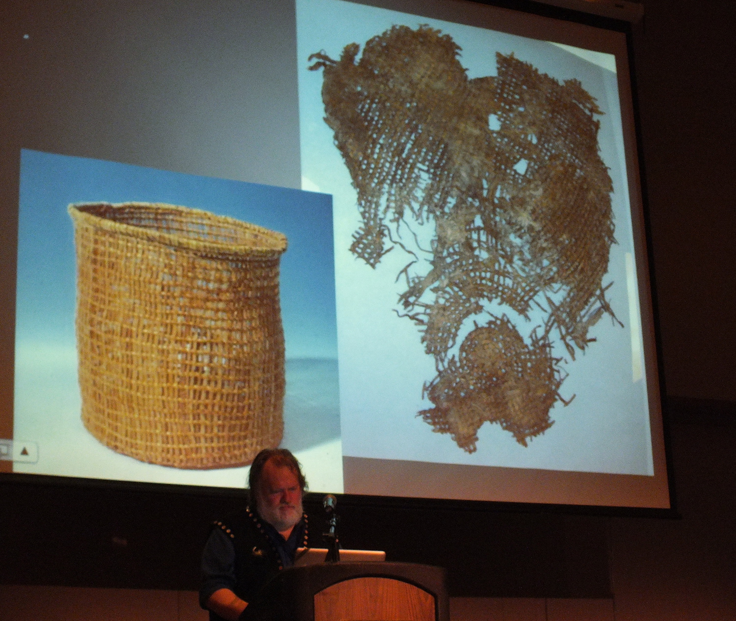 State curator of collections Steve Henrikson highlights a 6,000-year-old recovered basket fragment (right) and a replica (left) made by noted basket weaver Delores Churchill. (Photo by Matt Miller/KTOO)