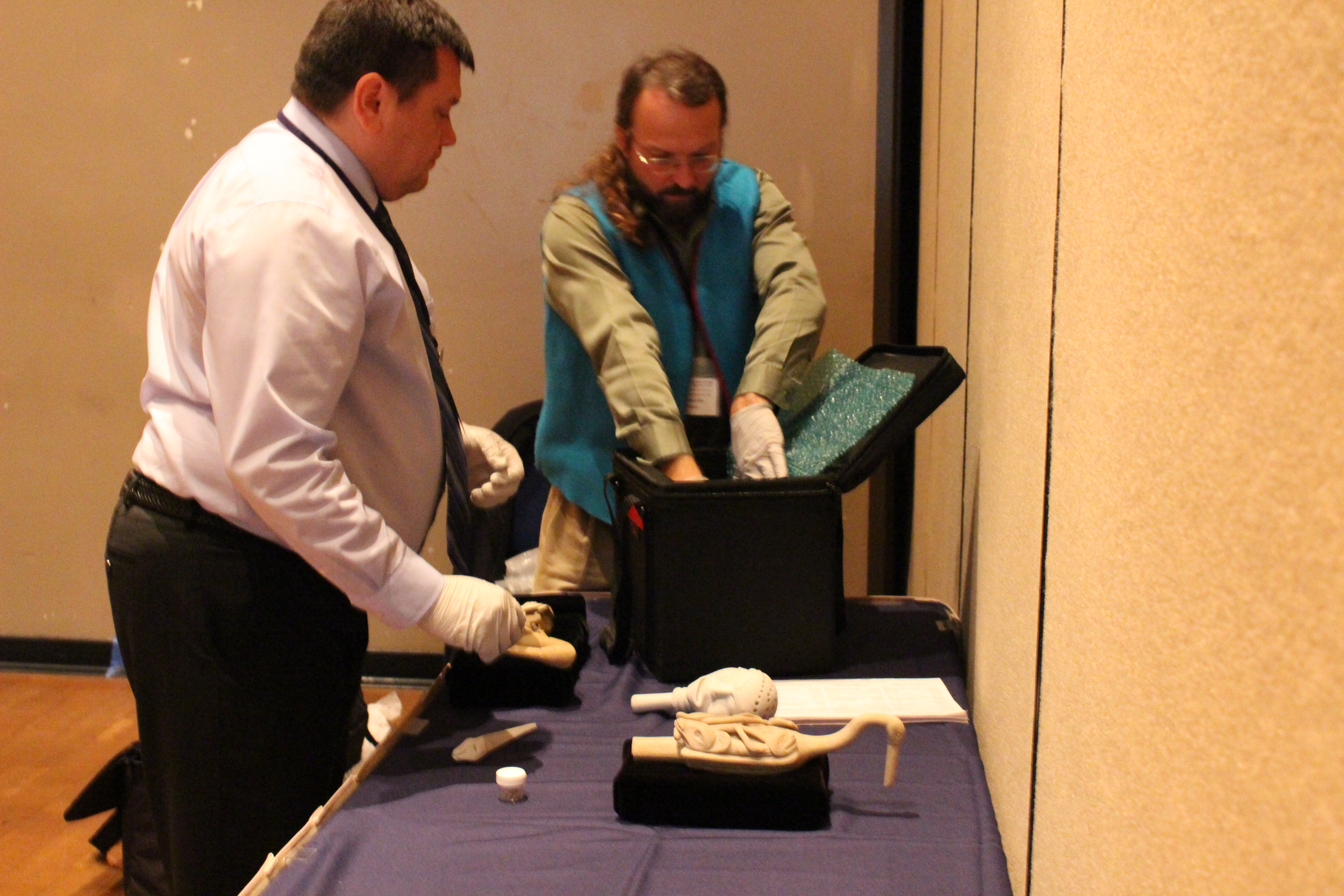 A group of people crowd around a small table in the back of the conference room at Centennial Hall. The 3D printed objects are carefully laid out. They’re gray and beige. Most are not painted yet.