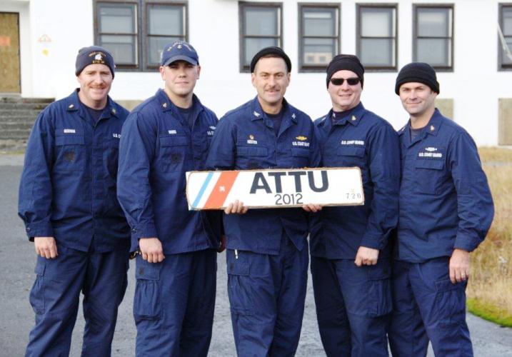 Five guys with interesting connections to Attu, from left to right: CWO Bryan Godwin served at USCG Long Range Aids to Navigation Station (LORSTA) Attu before closing; DCC Nick Mimms, also a LORSTA Attu veteran; Cutter Sherman Commanding Officer, Capt. Joe Hester; ETC Dale Piersol, previously stationed at several remote LORSTAs. He hoped to get LORSTA Attu before it closed in 2010; and BMC Shane Melott, whose grandfather served on Attu and Kiska Islands in WWII as a civilian engineer driving heavy machinery. Photo by Capt. Joe Hester.