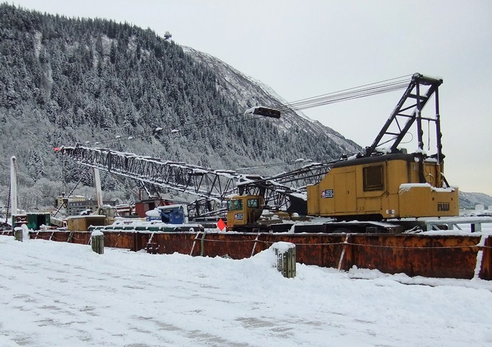 A barge with a crane is in place at Coast Guard Station Juneau to install a mooring dolphin this week.
