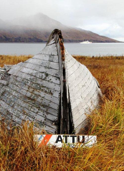 An old boat of bygone days on Attu Island. In the background, the Cutter Sherman is anchored in Massacre Bay. Photo by Capt. Joe Hester.