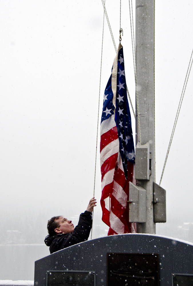 Col Duff Mitchell, retired from Army National Guard, raises the American flag. (Photo by Heather Bryant/KTOO)