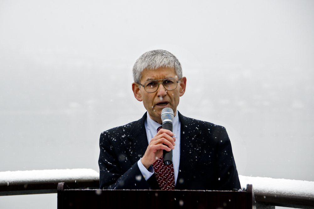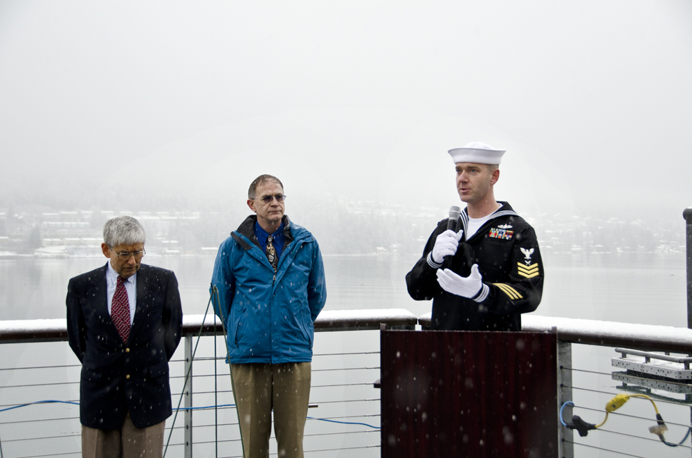 Some of the sounds and voices from Tuesday’s rededication of the U.S.S. Juneau Memorial included the Juneau Community Band, CBJ Port Director Carl Uchytil, an invocation by Lieutenant Colonel Pat Travers of the U.S. Air Force Reserve and who is also pastor of Saint Paul’s Church, CBJ Port Director Gary Gillette, U.S. Navy Petty Officer Gregory Cazemier, Assemblymember Randy Wanamaker, and trumpeter Dave Hurlbut.