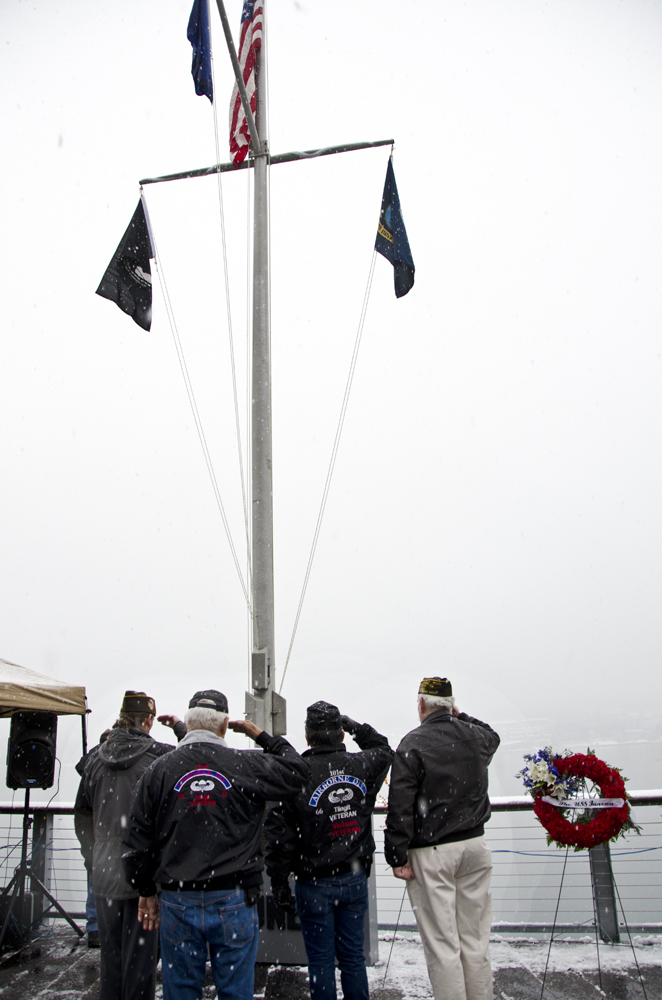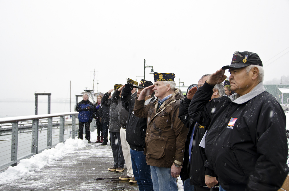 Veterans salute the flag after laying the wreaths. (Photo by Heather Bryant/KTOO)