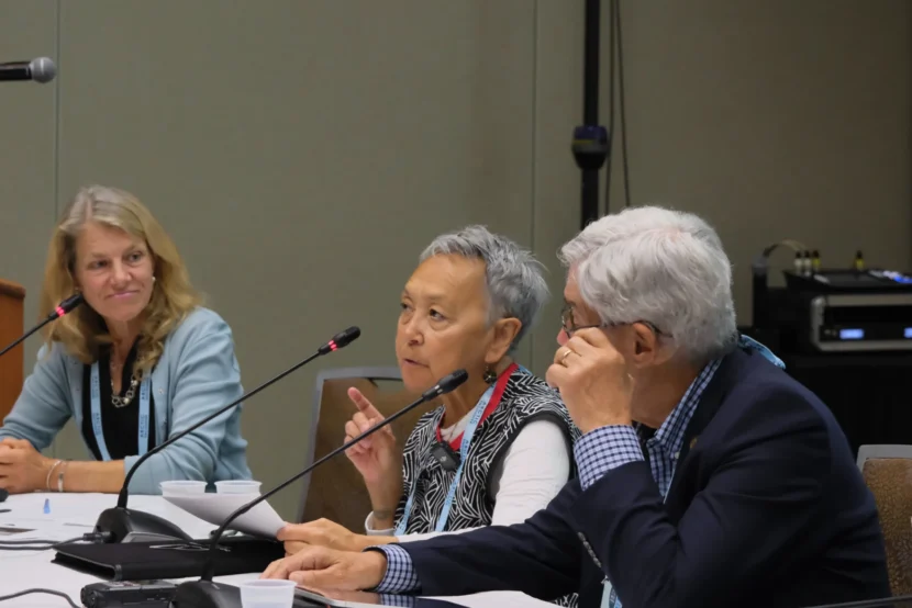 Vera Kingeekuk Metcalf (center) and Margaret Williams (left) speak during the Arctic Encounter Summit in Anchorage on July 31, 2025. Metcalf is the executive director of the Eskimo Walrus Commission. Williams is a senior fellow with the Arctic Initiative of the Harvard Kennedy School. (Photo by Alena Naiden/KNBA)