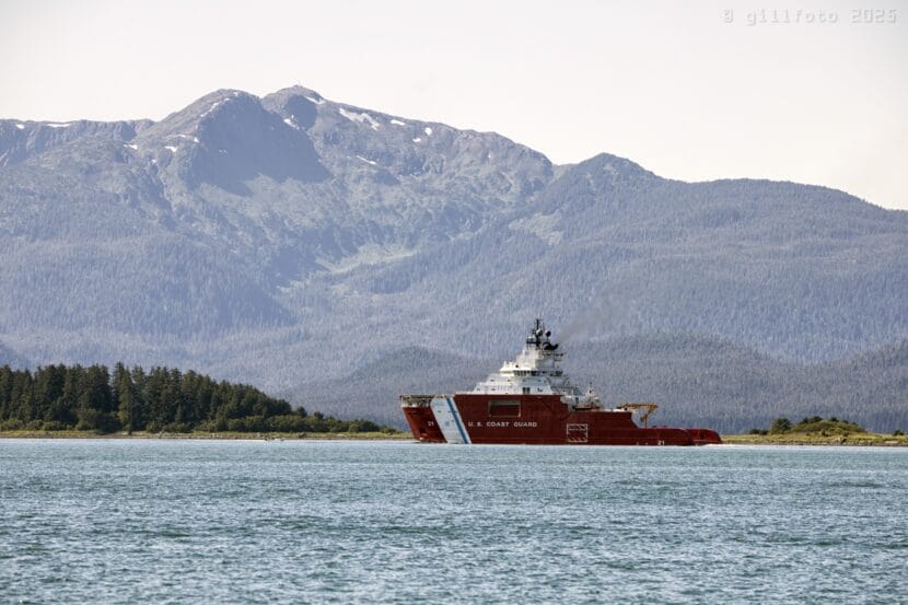 The U.S. Coast Guard icebreaker Storis passes Portland Island on its way to Juneau on Wednesday, Aug. 7, 2025. (Photo courtesy/ gillfoto)