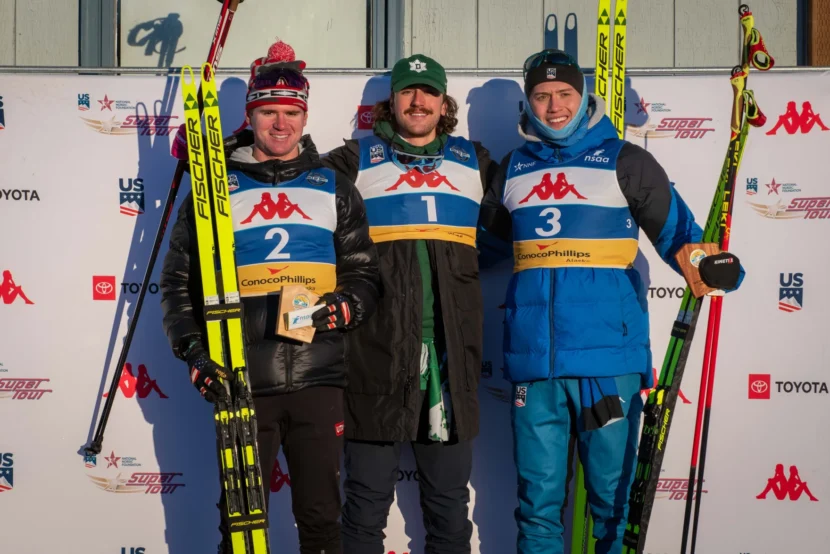 The 2025 U.S. Cross Country Ski Championships Men’s 10km Interval Start Free Technique podium for top U.S. racers: John Steel Hagenbuch (Dartmouth Ski Team, U.S. Ski & Snowboard Team) won the National title in a time of 21:23.4, followed by Walker Hall (Utah Ski Team) at 21:38, and Alaska’s Luke Jager (APU Nordic Ski Team, U.S. Ski & Snowboard Team) at 21:39.4. The races took place Thursday at Kincaid Park. (Scott Broadwell)