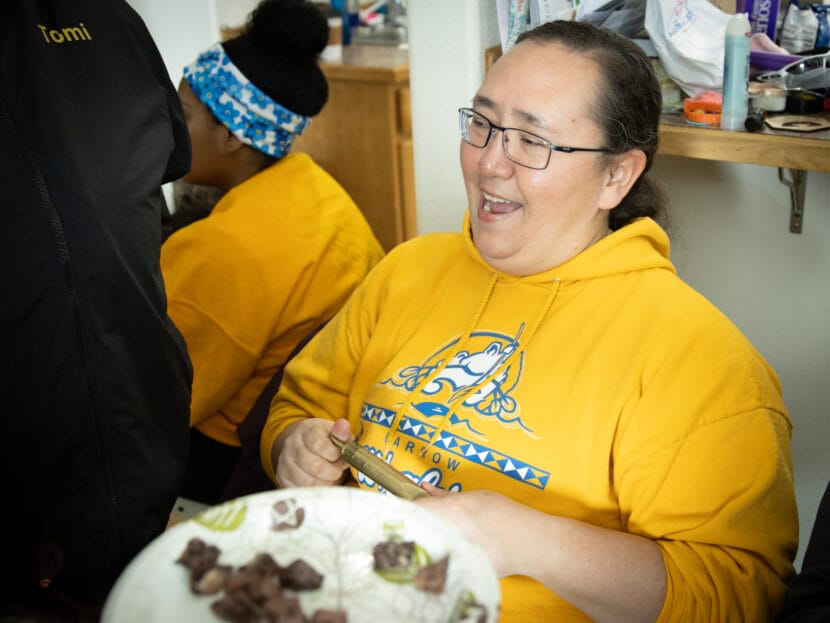 Natasha Itta laughs with the other members of the Aaluk Crew while preparing bowhead meat to share with the community of Utqiaġvik on April 24, 2024. (Valerie Lake/Alaska Public Media)