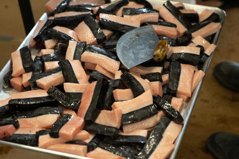 An ulu sits on top of a silver tray stacked with pieces of boiled maktak from a bowhead whale after being cooked by the Aaluk crew in Utqiaġvik on April 24, 2024. (Valerie Lake/Alaska Public Media)