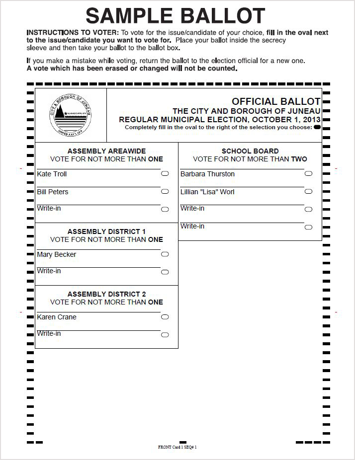 The 2013 municipal election is Tuesday, Oct. 1. Polls will be open from 7 a.m. to 8 p.m.Three seats are up for election on the Juneau Assembly: Area wide, District 1 and District 2. All are three-year terms. While candidates must live in the district in which they are seeking election, they are elected borough-wide. Two seats on the Juneau School District Board of Education are up for election; also three-year terms.